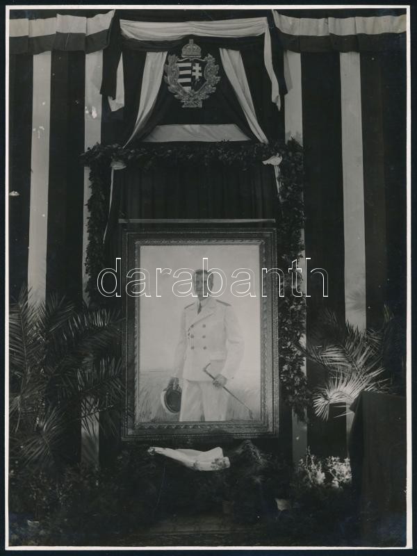 cca 1940 Horthy Miklós kormányzó portréja feldíszített környezetben, 23×17 cm<a href="https://www.darabanth.com/hu/gyorsarveres/423/kategoriak~Fotomuveszet/Foto~44/cca-1940-Horthy-Miklos-kormanyzo-portreja-feldiszitett-kornyezetben-23C39717-cm~II268