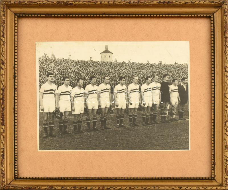 cca 1954 Aranycsapat fotója, rajta Puskás, Bozsik, Kocsis, Czibor, Grosics…stb., üvegezett fa keretben, a hátoldalon más sportolókat ábrázoló újságkivágásokkal, a keret hátoldalán tollas bejegyzésekkel, 12×17 cm, keret: 23×25 cm<a href="https://ww