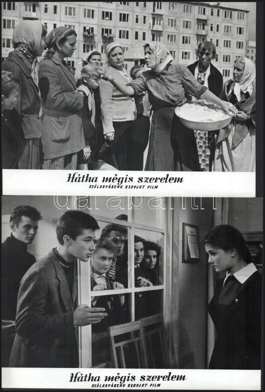 cca 1962 ,,Hátha mégis szerelem” című szovjet film jelenetei és szereplői, 21 db vintage produkciós filmfotó ezüst zselatinos fotópapíron, a használatból eredő (esetleges) kisebb hibákkal, 18×24 cm