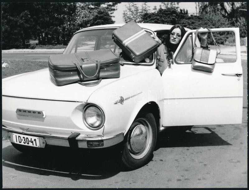 cca 1970 Armuth Iván (1929-1992) 2 db divatfotója, rajta táskákkal és skoda autóval, a hátoldalak pecsétekkel jelzettek, 18×13 cm<a href="https://www.darabanth.com/hu/gyorsarveres/424/kategoriak~Fotomuveszet/Foto~500021/cca-1970-Armuth-Ivan-1929-199