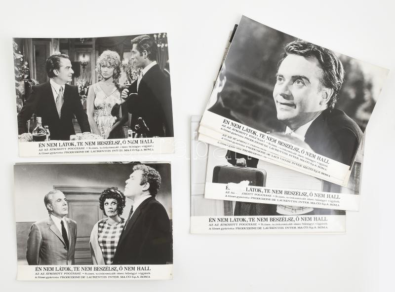 cca 1971 ,,Én nem látok, te nem beszélsz, ő nem hall’ című olasz bűnügyi vígjáték jelenetei és szereplői, 10 db vintage produkciós filmfotó ezüst zselatinos fotópapíron, a használatból eredő (esetleges) kisebb hibákkal, 18×24 cm<a href="https://www.