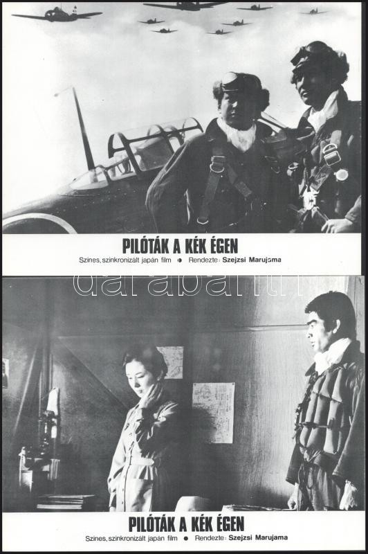 cca 1976 ,,Pilóták a kék égen” című japán film jelenetei és szereplői, 10 db produkciós filmfotó nyomdatechnikával sokszorosítva kartonpapírra (nyomat), egyoldalas nyomással, a használatból eredő (esetleges) kisebb hibákkal, 18×24