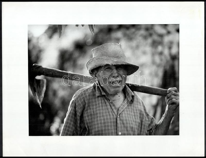 cca 1985 Gyenes Kálmán (1941-2016) szegedi fotóművész hagyatékából feliratozott, vintage fotóművészeti alkotás (Öregapám a szőlőben), ezüst zselatinos fotópapíron, Buenos Aires-i kiállítás emlékbélyegével, 30×38 cm<a href="https://www.darabanth.com/