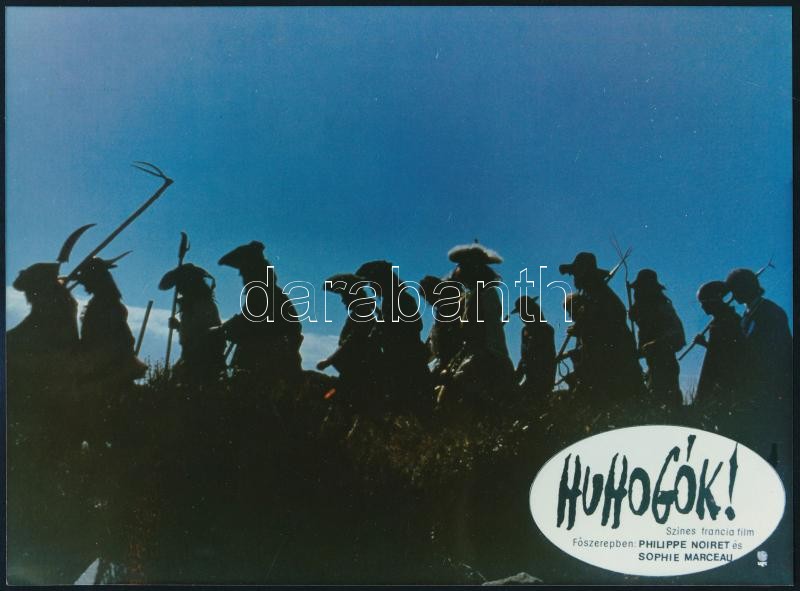 cca 1988 ,,Huhogók’ című francia film jelenetei és szereplői, 5 db vintage produkciós filmfotó, a használatból eredő (esetleges) kisebb hibákkal, + hozzáadva egy kisplakát kartonra nyomtatva, 18×24 cm<a href="https://www.darabanth.com/hu/gyorsarvere