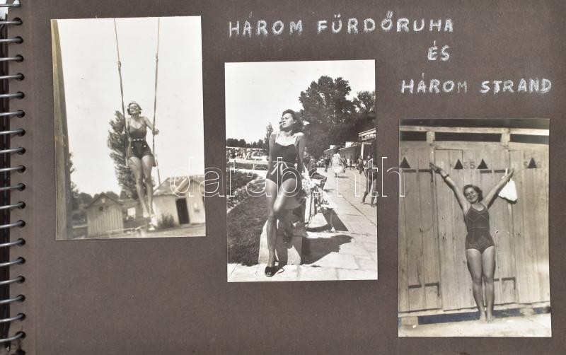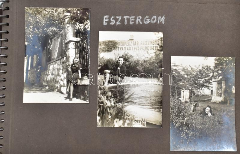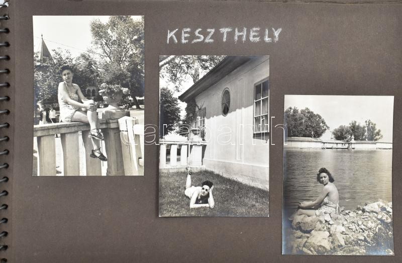 Családi fotóalbum, főként fürdőhelyeken készített életképekkel, portrékkal (Keszthely, Hévíz, Balatonföldvár, Halászbástya, stb.), vegyes méretű beragasztott fotókkal, feliratozva<a href="https://www.darabanth.com/hu/gyorsarveres/423/kategoriak~Foto