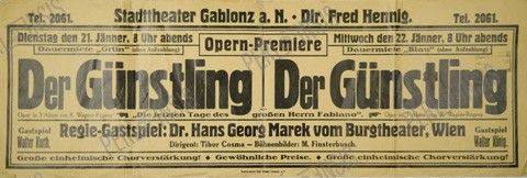 Színházi plakát – Der Günstling opera premier előadás (1936); Méret: 95 x 31,5