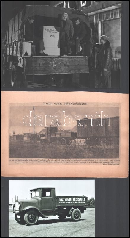 Különféle helyszíneken és eltérő időben készült felvételek teherautókról és haszongépjárművekről, 7 db vintage fotó és/vagy mai nagyítás, egy kép vasúti vontató teherautót ábrázol Kerny István hagyatékából, de ez sajnos csak újságkivágás képaláírással. Az