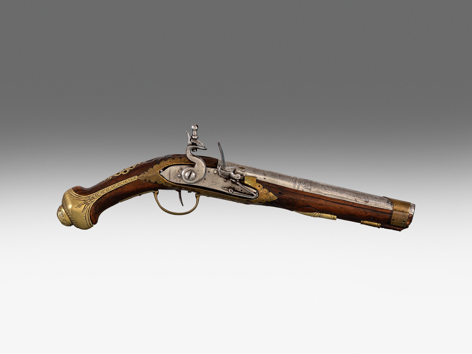 Balkáni elöltöltős pisztoly Barokk stílusú, faragott fa markolat, vésett sárgaréz díszítményekkel. Francia kovás elsütőszerkezettel, sima falú, nyolcszög alakú, hengerben végződő csővel. Csövén beütött, aranyozott fegyverkovács jelekkel. Kis javításokkal.