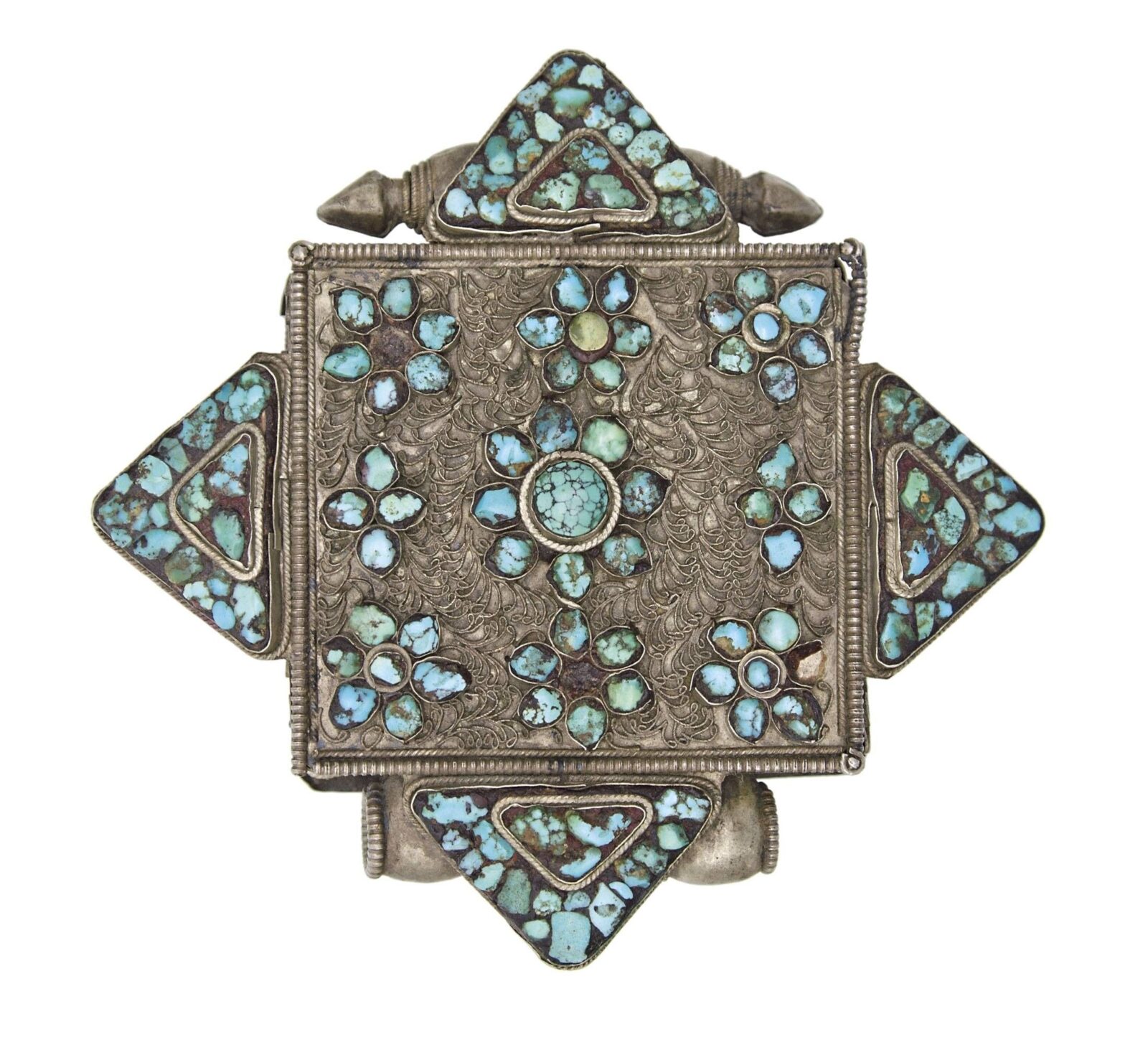 Tibet, 19. század, ezüst, filigrán díszítéssel, türkiz berakással, 9-es mágikus számnégyzet, hiányos, 11*12 cm