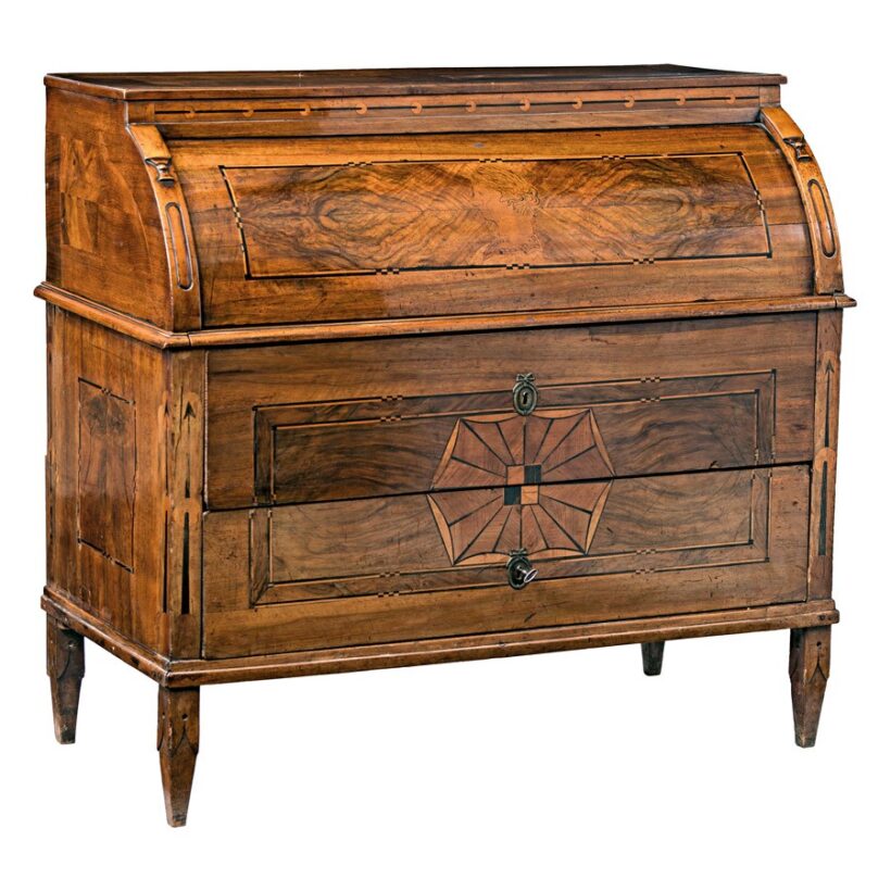 magyar, 1780 körül, fenyőfa alapon diófa borítással, jávorfa és paliszander intarziával, redőnye mögött hét kis fiókkal, lábazatán faragott díszítéssel, eredeti zárszerkezetekkel, kis sérüléssel, egy kulccsal, 112*118*60 cm