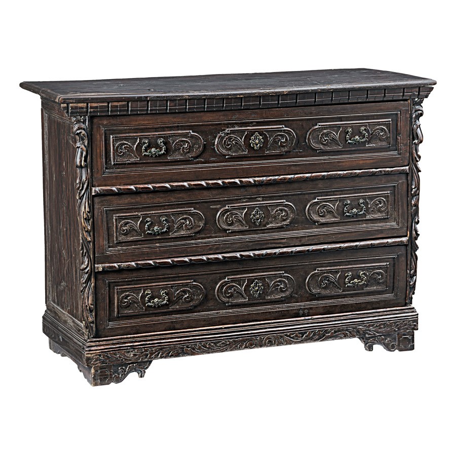 Itália, 17. sz., tömör fenyőfa és diófa, faragott díszítéssel, bronz veretekkel, sérült, 108*150*58 cm