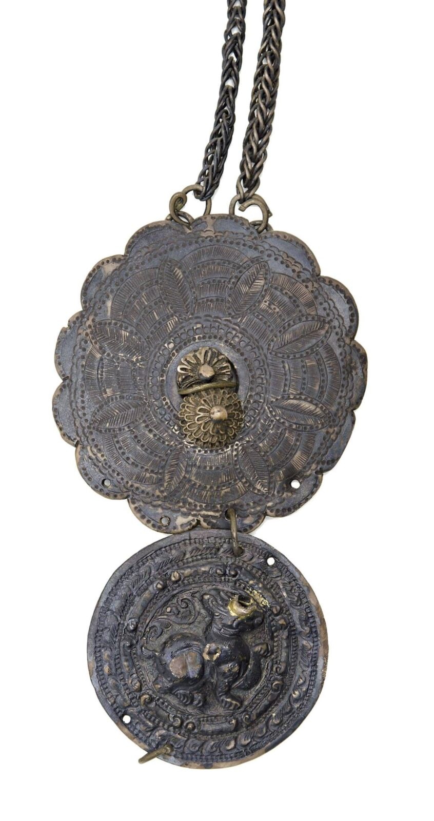 Tibet, 19. század, préselt, vésett sárgaréz, függők lánccal, sérült, hiányos, h: 57 cm