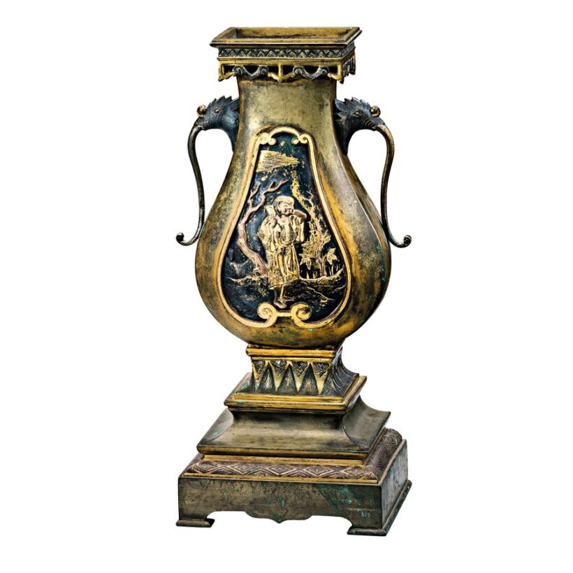 Kína, 19. sz. vége, bronz, festett, vésett díszítéssel, hiányos, 31*13*11 cm