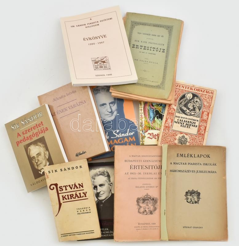 12 db piarista szerzőktől származó, ill. piarista témájú kiadvány (Balanyi György: Calasanzi Szent József élete; Jelenits István 2 könyve; Sík Sándor 3 könyve; A magyar kegyestanítórend budapesti gimnáziumának értesítője az