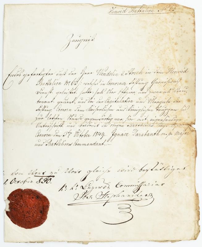 1850 Storch Vendel (1827-1886 után) 1848-49-es szabadságharcos, komáromi várőr részére kiállított bizonyítvány kézzel írt másolata (copia), amelyben igazolják hogy a komáromi várőrséghez tartozó 63. sz. honvéd zászlóaljban mint főtiszt hadnagyi rangban sz