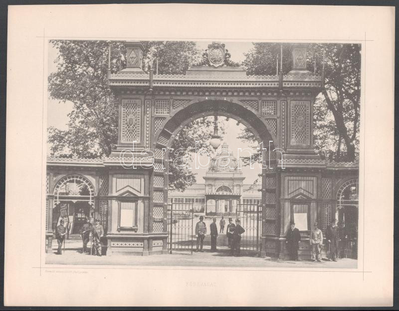 1885 Budapest, Országos Általános Kiállítás pavilonjai – főbejárat, nyomat Kozmata Műintézetéből, 26×33 cm