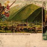 1893 (Vorläufer!!!) Rauris, Gruss aus der Kitzloch-Klamm. Meteorolog. Station a. d. Sonnblick. Lesk. u. Schwidernoch Art Nouveau, floral, litho (EK)