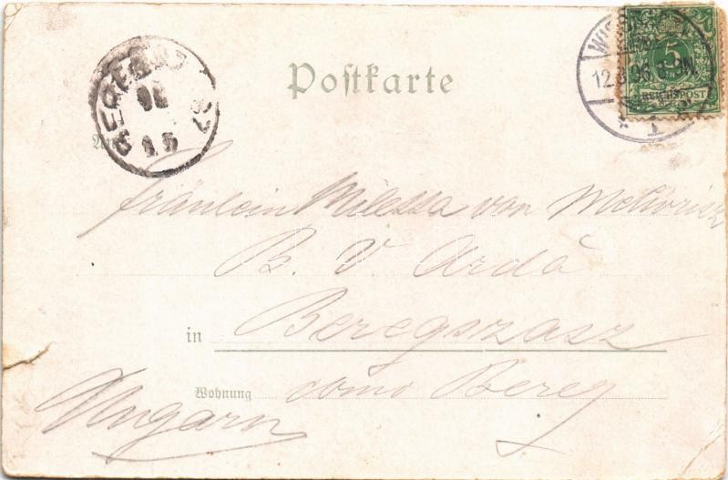 1896 (Vorläufer) Wiesbaden, Gruss aus dem Rathskeller Karl Bausenhart, Rathhaus, In Vino Veritas / town hall, restaurant interior. Rud. Bechtold & Co. Art Nouveau, floral, litho (tear)<a href="https://www.darabanth.com/hu/nagyaukcio/38/kategoriak~K