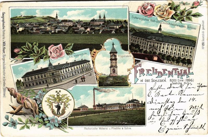 1897 (Vorläufer!) Bruntál, Freudenthal; Erzherzog Hoch- und Deutschmeistersches Schloss, K.K. Webeschule, Klippelsäule, Mechanische Weberei v. Plischke & Söhne, Stadtwappen / castle, weaving school, mechanical weaving mill, coat of arms. Geographisches Po