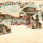 1897 (Vorläufer) Pozsony, Pressburg, Bratislava; Sétatér, Főtemplom, Városház, Színház / promenade, church, town hall, theatre. Kunstanstalt Rosenblatt Art Nouveau, floral, litho (EK)