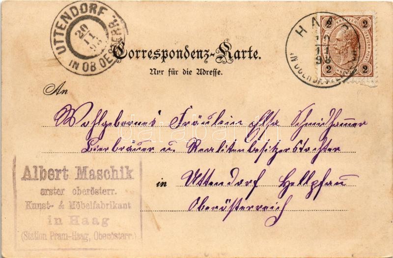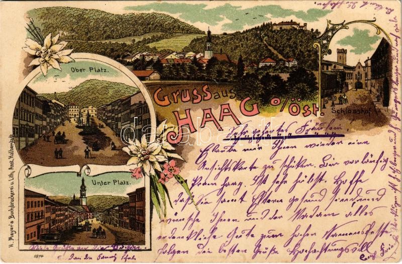 1898 (Vorläufer) Haag, Ober Platz, Schlosshof, Unter Platz. H. Meyer Art Nouveau, floral, litho<a href="https://www.darabanth.com/hu/gyorsarveres/422/kategoriak~Kepeslapok/Ausztria~1500047/1898-Vorlaufer-Haag-Ober-Platz-Schlosshof-Unter-Platz-H-Meye