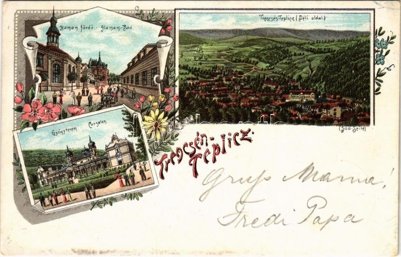 1898 (Vorläufer) Trencsénteplic, Trencianske Teplice; Hamam fürdő, gyógyterem, déli oldal / Bad, Cursalon / Turkish spa, sanatorium. Art Nouveau, floral, litho<a href="https://www.darabanth.com/hu/nagyaukcio/38/kategoriak~Kepeslapok/Felvidek~15649/1