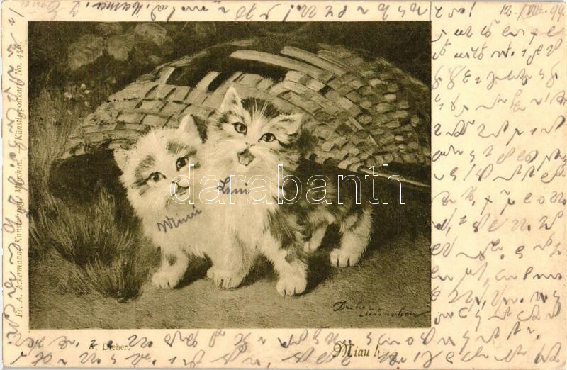 1899 Cats with basket, A. Ackermann Kunstverlag – Künstlerpostkarte No. 456, s: A. Dreher<a href="https://www.darabanth.com/hu/gyorsarveres/417/kategoriak~Kepeslapok/Macska~1500038/1899-Cats-with-basket-A-Ackermann-Kunstverlag–Kunstlerpostkarte-No-