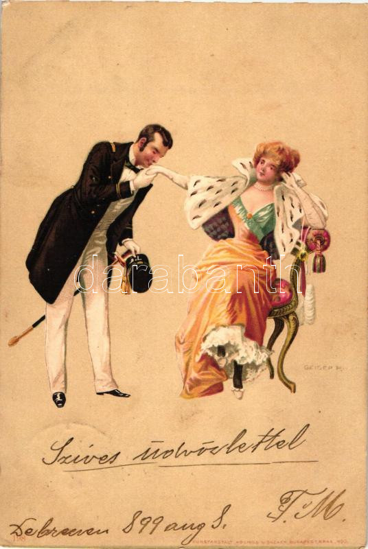 1899 Couple, Kosmos 198. litho s: Geiger R.<a href="https://www.darabanth.com/hu/gyorsarveres/417/kategoriak~Kepeslapok/Muveszlapok~1500040/1899-Couple-Kosmos-198-litho-s-Geiger-R~II1239684/?utm_source=affiliate&utm_medium=mutargy&utm_campaign=allan
