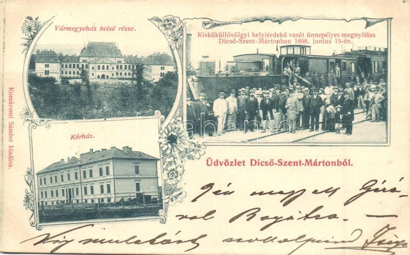 1899 Dicsőszentmárton, Tarnaveni; Vármegyeház, Kórház, Kisküküllő-völgyi helyiérdekű vasút ünnepélyes megnyitása 1898-ban, Komáromi Sándor kiadása / county hall, hospital, opening ceremony of the railway, floral<a href="https://www.darabanth.com/hu/