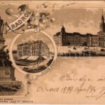 1899 (Vorläufer) Arad, Vértanú szobor, Színház, lóvasút, Városháza. Lengyel Lipót kiadása / statue, monument, town hall, horse-drawn tram. Art Nouveau, floral, litho (EB)