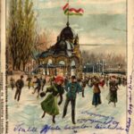 1899 (Vorläufer) Budapest XIV. Városliget, korcsolyázók a pavilonnál télen, magyar zászló. Kunstanstalt Kosmos S. IX. litho – ‘Legjobb az újpesti gyárban készült Villányi féle csokoládé, cacaopor és különféle teasütemény’