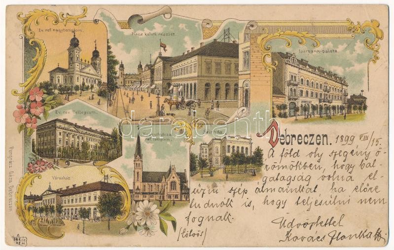 1899 (Vorläufer) Debrecen, Református nagytemplom, Piac keleti részlet, Református Collegium, Iparbank palota, üzletek, Színház, Kossuth utcai református templom, Városháza. Pongrácz Géza kiadása. Art Nouveau, floral, litho (Rb)