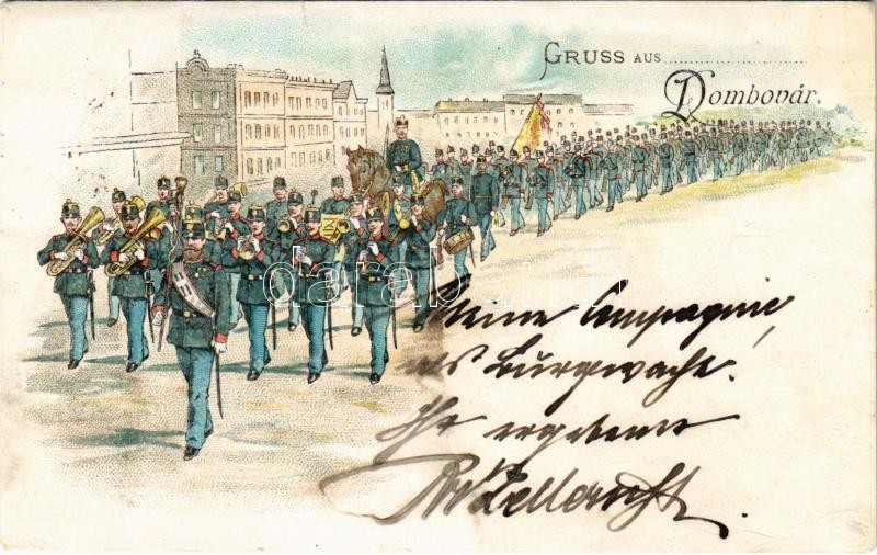 1899 (Vorläufer) Gruss aus… Dombóvár / Austro-Hungarian K.u.K. military art postcard, soldiers marching. Art Nouveau, litho (r)