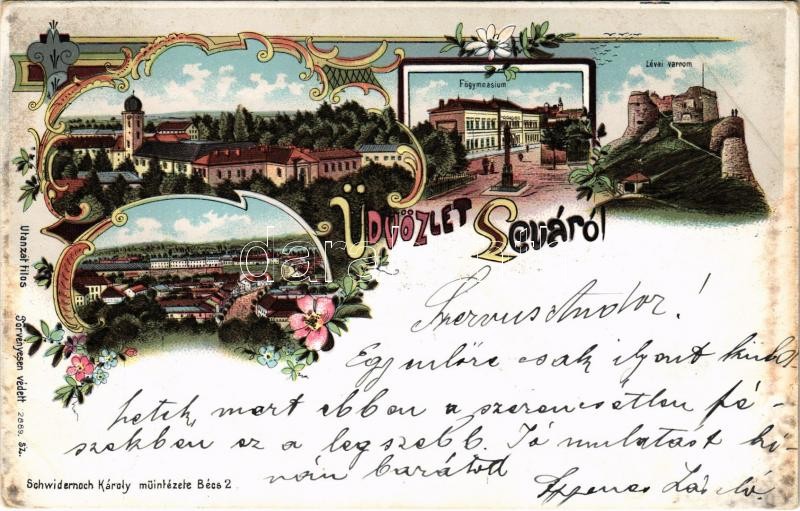 1899 (Vorläufer) Léva, Levice; Főgimnázium, várrom. Schwidernoch Károly kiadása / grammar school, castle ruin. Art Nouveau, floral, litho (EK)