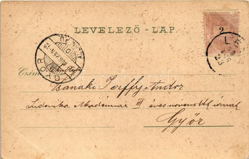 1899 (Vorläufer) Léva, Levice; Főgimnázium, várrom. Schwidernoch Károly kiadása / grammar school, castle ruin. Art Nouveau, floral, litho (EK)<a href="https://www.darabanth.com/hu/nagyaukcio/38/kategoriak~Kepeslapok/Felvidek~15649/1899-Vorlaufer-Lev