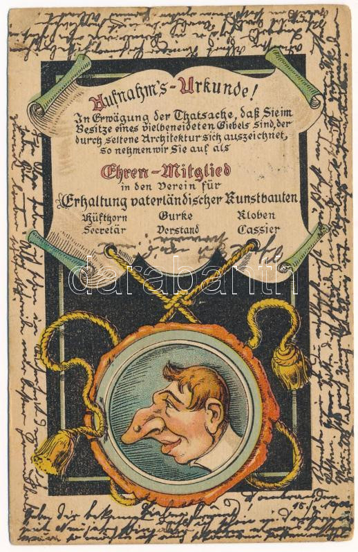1900 Aufnahm’s-Urkunde! Ehren-Mitglied in den Verein für Erhlatung vaterländischer Kunstbauten / Felvételi bizonyítvány! humor / Art Nouveau German admission certificate humour, litho (fa)<a href="https://www.darabanth.com/hu/nagyaukcio/39/kategoria