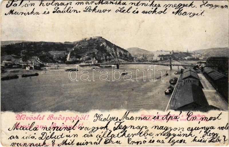 1900 Budapest, Ferenc József híd, Gellérthegy (még nincs Gellért tér, szálló se egyetem), pesti rakpart (szakadás / tear)<a href="https://www.darabanth.com/hu/gyorsarveres/412/kategoriak~Kepeslapok/Magyarorszag~2000006/1900-Budapest-Ferenc-Jozsef-hi