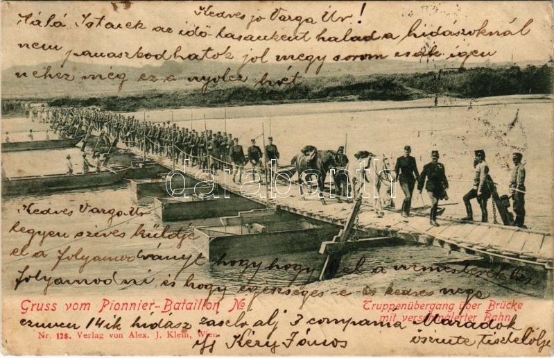 1900 Gruss vom Pionnier-Bataillon. Truppenübergang über Brücke mit verschmalerter Bahn. Verlag v. Alex. J. Klein / Austro-Hungarian K.u.K. military, troops crossing a pontoon bridge (kis szakadás / small tear)<a href="https://www.darabanth.com/hu/gy
