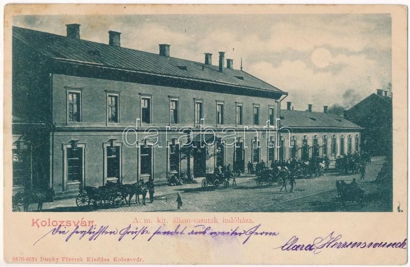 1900 Kolozsvár, Cluj; A Magy. Kir. Államvasutak indóháza, MÁV vasútállomás. Dunky fivérek / railway station (fl)<a href="https://www.darabanth.com/hu/gyorsarveres/415/kategoriak~Kepeslapok/Erdely~1000006/1900-Kolozsvar-Cluj-A-Magy-Kir-Allamvasutak-i