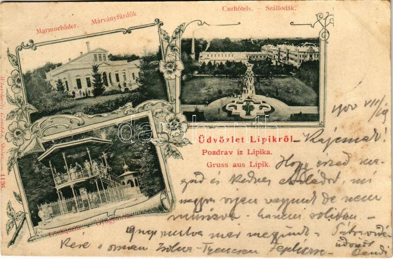 1900 Lipik, Marmorbäder, Curhotels, Trinkquelle / Márványfürdők, szállodák, gyógyforrás. Kiadja Wlaszlovits Gusztáv 1126. / marble baths, hotels, spa, bathing house. Art Nouveau, floral (fl)