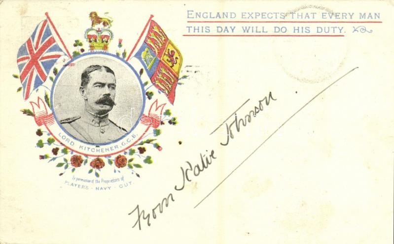 1900 Lord Kitchener, G.C.B., ‘England expects that every man this day will do his duty’, flags, floral<a href="https://www.darabanth.com/hu/gyorsarveres/417/kategoriak~Kepeslapok/Katonai~1500034/1900-Lord-Kitchener-GCB-England-expects-that-every-man