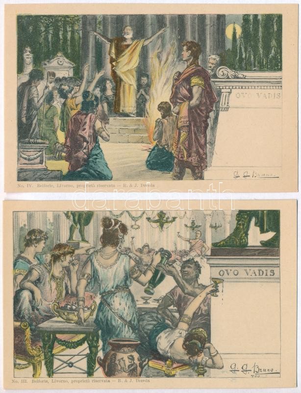 1900 Quo Vadis – 9 darabos litho képeslapsorozat G.G. Bruno rajzaival, használatlan kiváló minőségben, 1 lap szakadt. Belforte, Livorno / Quo Vadis – postcard series of 9 litho art postcards, signed by G.G. Bruno, unused in excellent