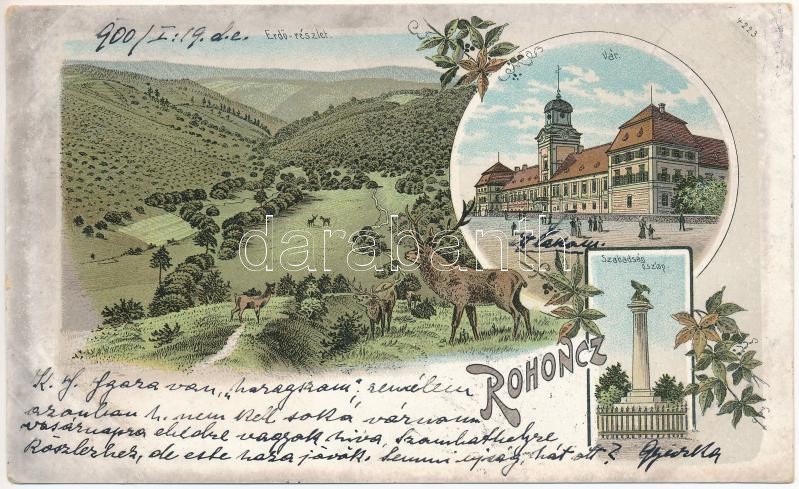 1900 Rohonc, Rechnitz; Erdő részlet, vár, Szabadság oszlop / Schloss, Denkmal, Wald / castle, forest, column monument. Art Nouveau, floral, litho<a href="https://www.darabanth.com/hu/gyorsarveres/422/kategoriak~Kepeslapok/Burgenland~1500010/1900-Roh
