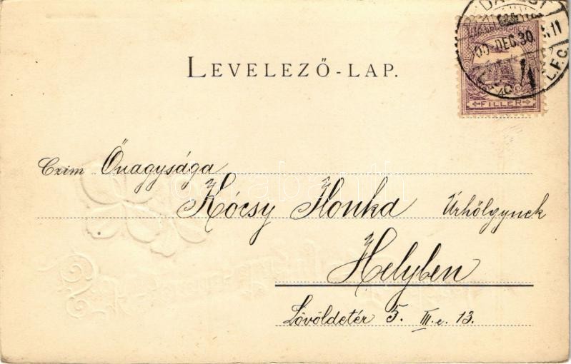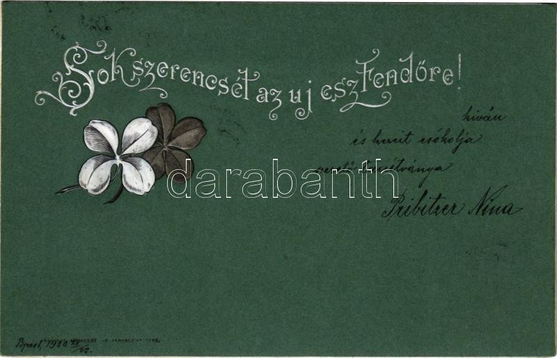 1900 Sok szerencsét az új esztendőre! / New Year greeting art postcard with clovers. Emb. litho<a href="https://www.darabanth.com/hu/gyorsarveres/423/kategoriak~Kepeslapok/Udvozlolapok-Unnepek~1500093/1900-Sok-szerencset-az-uj-esztendore-New-Year-gr