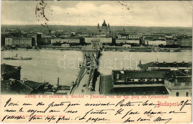 1901 Budapest, Lánchíd, látkép a királyi palotától (kis szakadás / small tear)<a href="https://www.darabanth.com/hu/gyorsarveres/420/kategoriak~Kepeslapok/Magyarorszag~1000004/1901-Budapest-Lanchid-latkep-a-kiralyi-palotatol-kis-szakadas-small-tear~