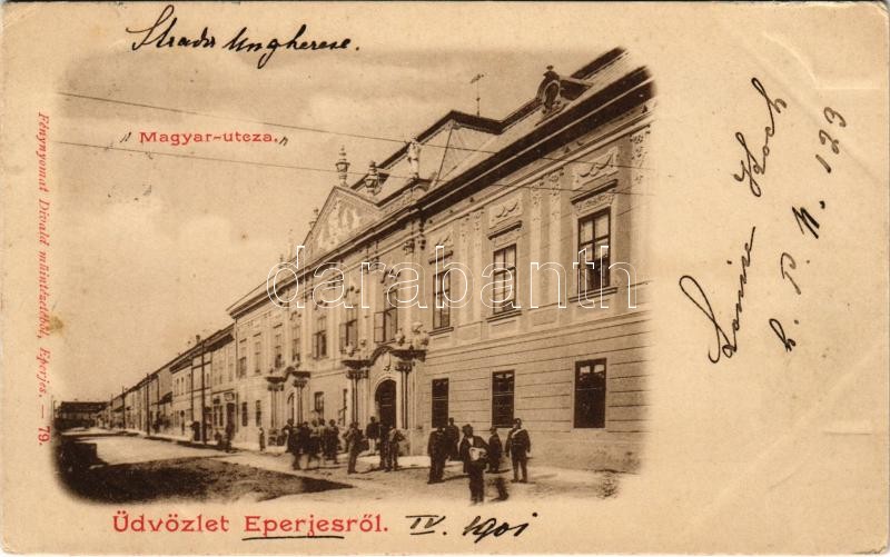 1901 Eperjes, Presov; Magyar utca. Fénynyomat Divald műintézetéből / street view (EK)<a href="https://www.darabanth.com/hu/gyorsarveres/411/kategoriak~Kepeslapok/Felvidek~1000101/1901-Eperjes-Presov-Magyar-utca-Fenynyomat-Divald-muintezetebol-street