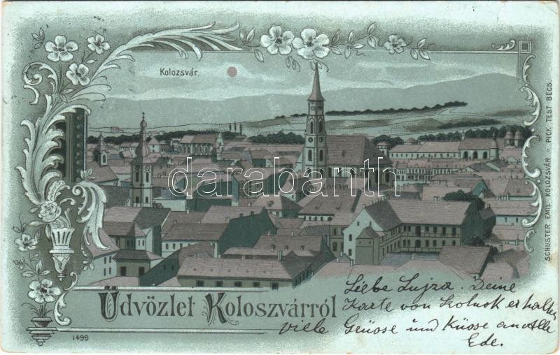 1901 Kolozsvár, Cluj; látkép. Schuster Emil kiadása / general view. Art Nouveau, floral, litho (EK)