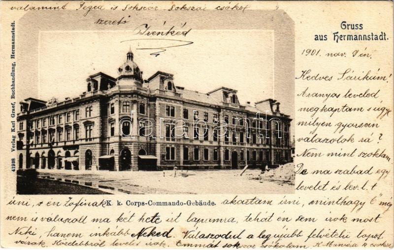 1901 Nagyszeben, Hermannstadt, Sibiu; Cs. és kir. Hadtestparancsnokság / K.k. Corps-Commando Gebäude. Verlag Karl Graef / Military Corps Headquarters