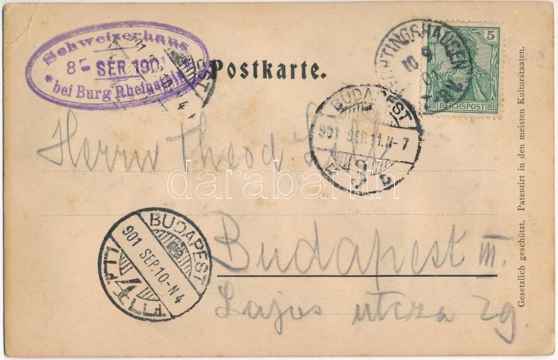 1901 Trechtingshausen, Gruss vom Schweizerhaus bei Burg Theinstein / hotel, inn. Stengel Emb. (EK)<a href="https://www.darabanth.com/hu/gyorsarveres/417/kategoriak~Kepeslapok/Nemetorszag~1500072/1901-Trechtingshausen-Gruss-vom-Schweizerhaus-bei-Burg