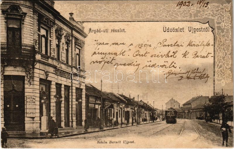 1902 Budapest IV. Újpest, Árpád úti részlet, kávéház, villamos. Schön Bernát kiadása (fl)<a href="https://www.darabanth.com/hu/gyorsarveres/411/kategoriak~Kepeslapok/Magyarorszag~1000005/1902-Budapest-IV-Ujpest-Arpad-uti-reszlet-kavehaz-villamos-Sch